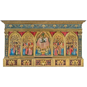 This Gothic altarpiece, on display in the Baroncelli chapel in Florence's Santa Croce basilica, depicts the Coronation of the Virgin Mary. In the center, Christ crowns the Virgin Mary. The side panels show saints accompanied by angel musicians. Attributed to Giotto, or his pupil Taddeo Gaddi, this polyptych is a major work of Florentine art of the 14th century.