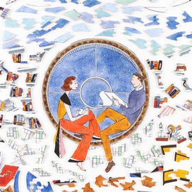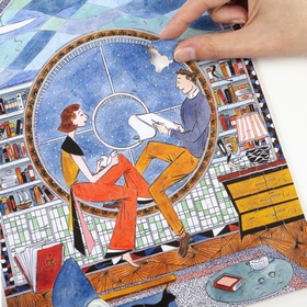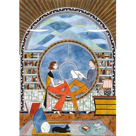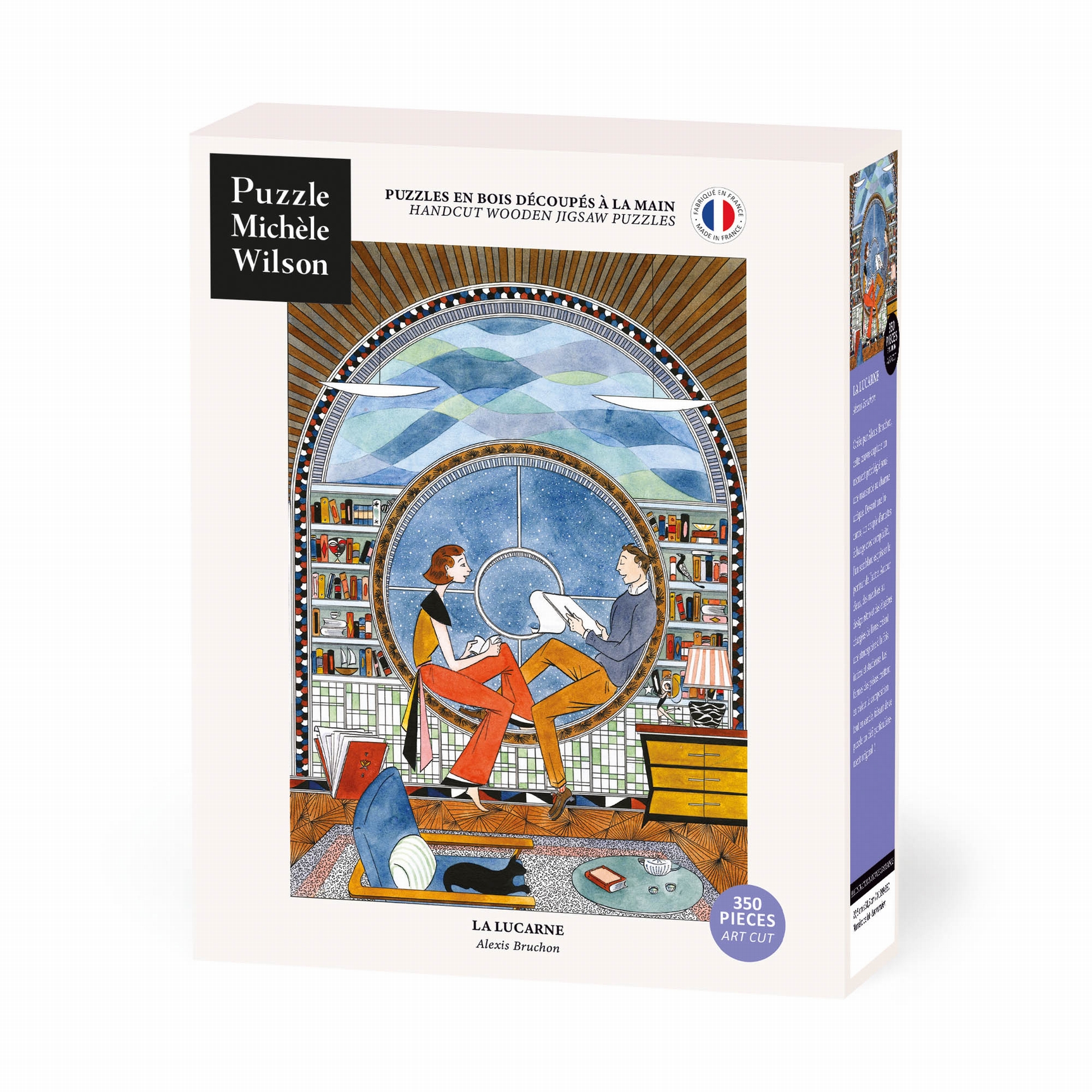 Created by Alexis Bruchon, this work captures a moment in time in a uniquely charming attic. In front of a skylight, a pair of artists are in conversation, one seemingly drawing the portrait of the other. Around them are retro-designed pieces of furniture and book-laden shelves, creating an intimate, studious atmosphere. The shapes of the pieces highlight the circular composition, making this puzzle a particularly original challenge!