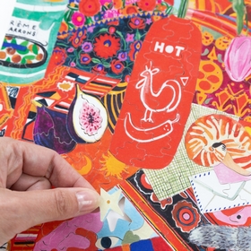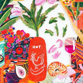 Papier Coton is the pseudonym of a contemporary Bordeaux illustrator with a passion for gouache and watercolor art. In this illustration, a bottle of sriracha sauce is transformed into a vase, surrounded by figs, a pot of crème de marron, various motifs and even a shrimp. Each element naturally intertwines itself into a broader composition full of liveliness and surprises!