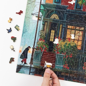 In this illustration, New York-based Lithuanian artist Laura El pays tribute to the antique stores that fascinate her so much in the United States. Inspired by these storefronts so full of history, she depicts a New York street corner scene, where a passer-by walks their dog past one of these stores. The jigsaw brings out every detail with the utmost clarity, inviting you to take a slow stroll down the street and explore the secrets of this charming urban scene.