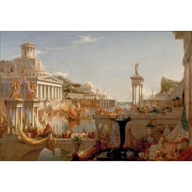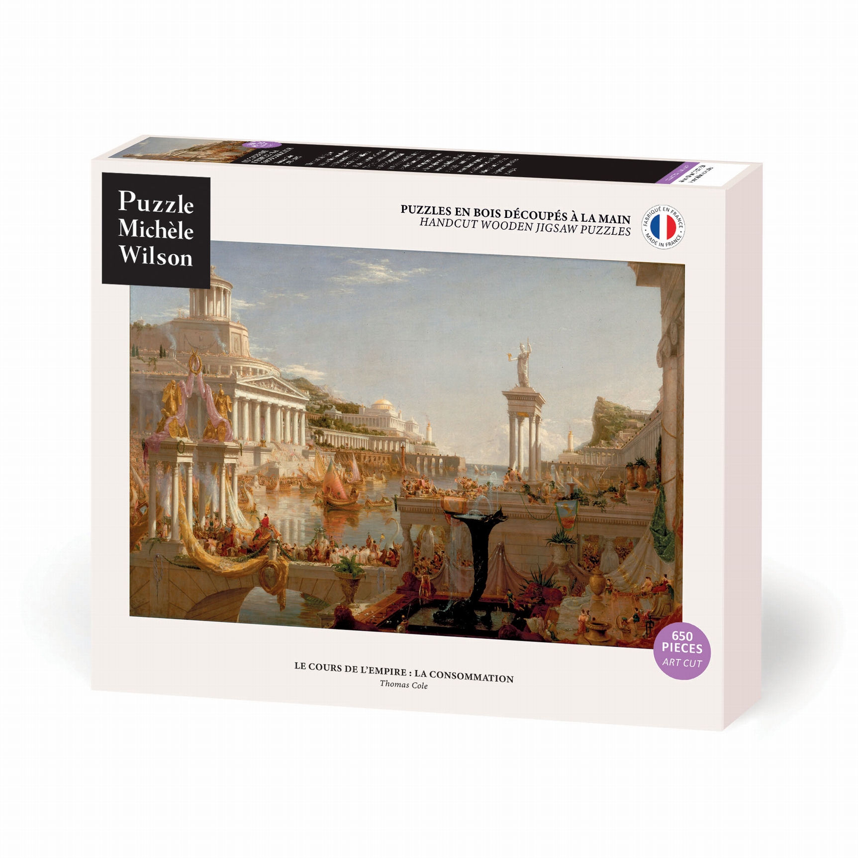 Thomas Cole, a major figure of American Romanticism and founder of the Hudson Valley School, painted The Course of Empire - The Consummation in 1836. This is one of a series of paintings illustrating the cycle of a civilization, here at its apogee, with a prosperous, sumptuous city symbolizing excess and imminent decline. As you piece together this puzzle, you will explore the rich details of the citys architecture, characters and landscapes.