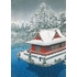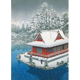 This print by Hasui Kawase depicts the Benten Shrine in Inokashira Park under a blanket of snow. The artist adopts an original, almost aerial, low-angle view, giving an unusual look on the subject of the work. The bright red color of the shrine stands out against the wintry white, presenting a modern composition so typical of the shin-hanga movement.