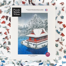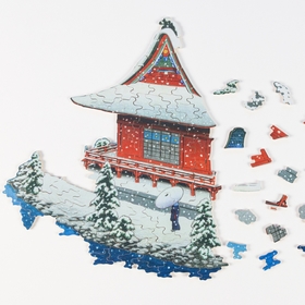 The shapes of the puzzle pieces serve to enhance the shape of the shrine - the architecture is distinguished by its angular lines, the water elements stretch out away from the focal point of the building, while the snow and sky have gently rounded features. Each nuance of the piece is slowly revealed as you put the puzzle together - the deep blue of the water, the bright red of the shrine and the luminous white of the snow-covered surroundings.