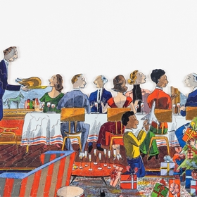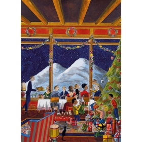 Alexis Bruchon, an artist based in the French city of Clermont-Ferrand, mixes India ink and watercolors in his Art Deco inspired illustrations. In this cheerful Christmas scene, the adults prepare to enjoy the turkey while their children excitedly open their presents. The artist creates a magnificent color contrast between the warmth and vivid hues of Christmas and the blues of the outdoor landscape.
