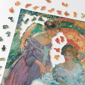 Richard E. Miller, a member of the Giverny group, is a leading figure in American Impressionism. Painted in 1910, this scene highlights the artist's colorful virtuosity and his taste for decorative compositions influenced by Japanese art. The pieces in this puzzle match the rounded shapes of the parasol, table and draped fabrics.
