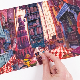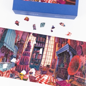 Rébecca Dautremer is a French author and illustrator, renowned for the delicacy and beauty of her world, filled with rich and whimsical stories. Her beloved character, Jacominus the rabbit, takes both children and adults on adventures full of tenderness and humor. This illustration is taken from the book Une chose formidable (A Wonderful Thing), where Jacominus revisits his memories. As you piece together this puzzle, find him as a child alongside his friend Policarpe, in his grandmother's kitchen, marveling at the enormous cake being prepared!