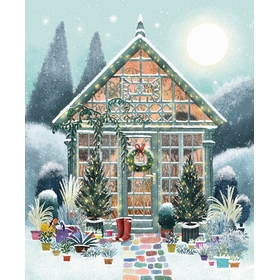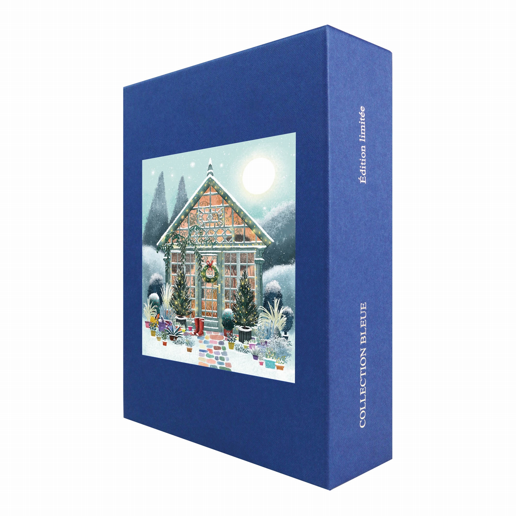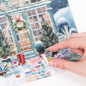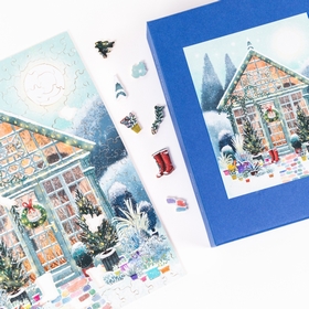 This snowy Victorian greenhouse was created by illustrator Laura Watkins, who lives and works in London. Its soft, pastel hues bathe the scene in a soothing light. The fine details invite the viewer to linger over each element of the piece. At the foot of the greenhouse, a pair of boots hints at the presence of someone inside, adding a touch of mystery. The jigsaw puzzle precisely follows the chiseled lines of the architecture, highlighting the snow-tipped plants.