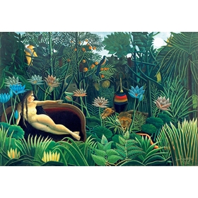 Henri Rousseau, surnommé Le Douanier Rousseau, est l'un des représentants majeurs de l'art naïf. Bien qu'il n'ait jamais quitté la France, il crée de nombreux paysages de jungle inspirés par les livres illustrés et les jardins botaniques. En 1910, il peint Le Rêve, un grand tableau d'environ deux mètres par trois. Dans cette jungle imaginaire aux fleurs démesurées, une femme est allongée sur un canapé.