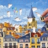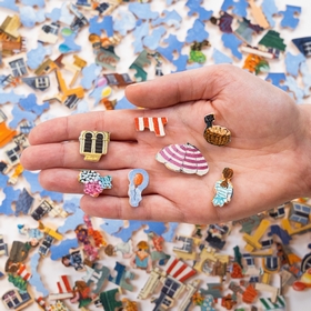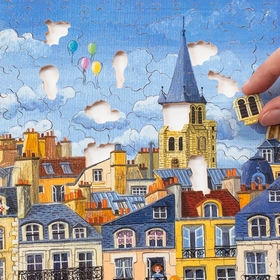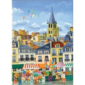 Cellia Saubry, artiste peintre française d'art naïf, représente avec une palette vive les souvenirs des lieux où elle a vécu. Cette toile montre le marché animé de Saint-Germain-des-Prés, avec au premier plan un étal de fleurs qui attire le regard. Derrière les stands aux stores rayés, les toits de Paris se déploient en une mosaïque, surplombés par la silhouette de l'église Saint-Germain. Les ballons multicolores vous guideront pour recomposer le ciel radieux !