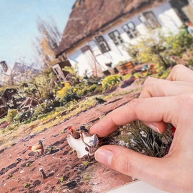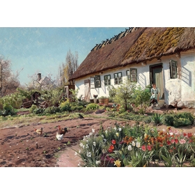 Cette oeuvre, offrant un point de vue original sur une maison au toit de chaume, est signée Peder Mørk Mønsted, artiste danois spécialiste des scènes de campagne. Il aime restituer les subtilités, les couleurs et les lumières de chaque saison. Au premier plan, des tulipes colorent le jardin, tandis que la terre, terrain de jeu des coqs, promet de prochaines récoltes. Passez du temps avec la jeune femme assise sur les marches de la chaumière et découvrez pleinement cette scène d'un réalisme virtuose !