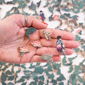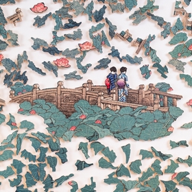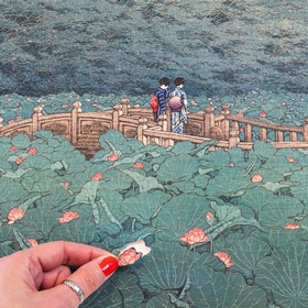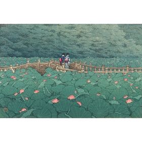 Réalisée dans les années 1930, cette estampe représente le jardin Benten à Shiba. La végétation luxuriante recouvre entièrement l'étang : les nénuphars géants remplissent la scène, laissant apparaître uniquement un pont et deux silhouettes délicates. L'artiste, figure majeure du mouvement shin-hanga (renouveau pictural japonais), capture avec une grande sensibilité les formes, textures et couleurs de cette nature omniprésente. Un vrai challenge pour les amateurs de puzzles et d'art japonais !