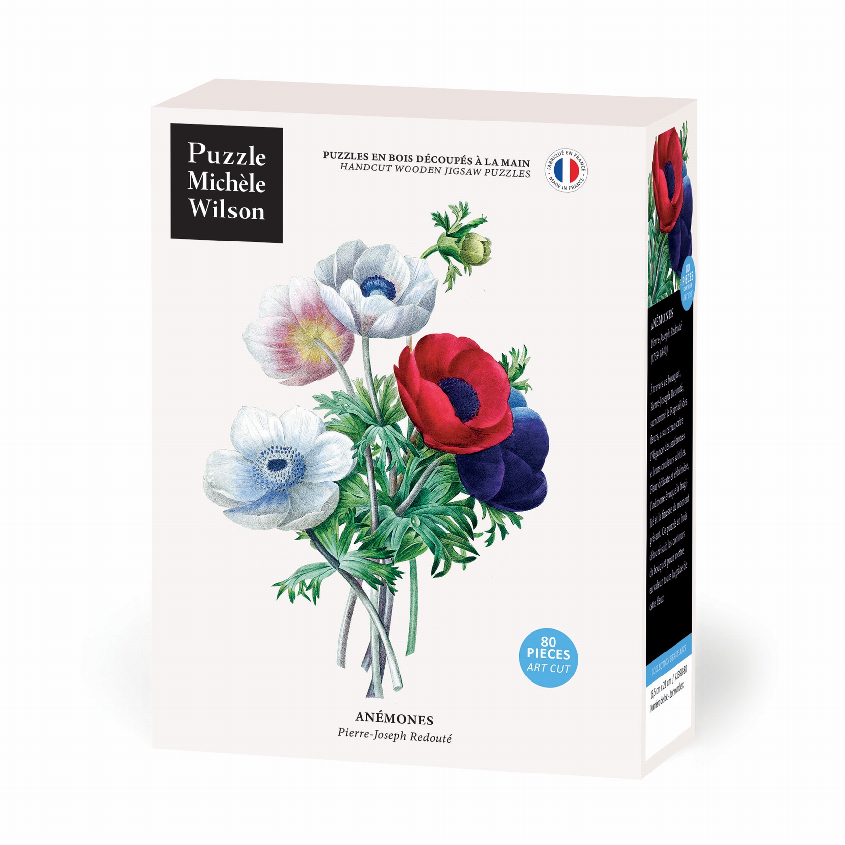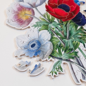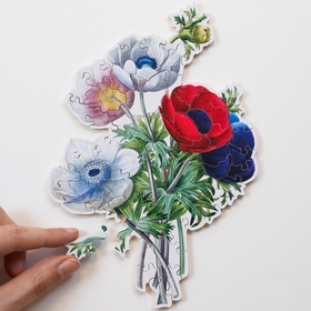 À travers ce bouquet, Pierre-Joseph Redouté, surnommé le Raphaël des fleurs, a su retranscrire l'élégance des anémones et leurs couleurs subtiles. Fleur délicate et éphémère, l'anémone évoque la fragilité et la finesse du moment présent. Ce puzzle en bois détouré suit les contours du bouquet pour mettre en valeur toute la grâce de cette fleur.
