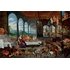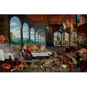 Ce tableau, réalisé par Jan Bruegel le Jeune, peintre flamand du début du 17e siècle et petit-fils de Pieter Bruegel l'Ancien, représente une somptueuse scène de banquet mêlant nature morte et art de la table. L'oeuvre célèbre le plaisir de manger et de boire à travers un riche assortiment de fleurs, fruits, mets raffinés et objets précieux.